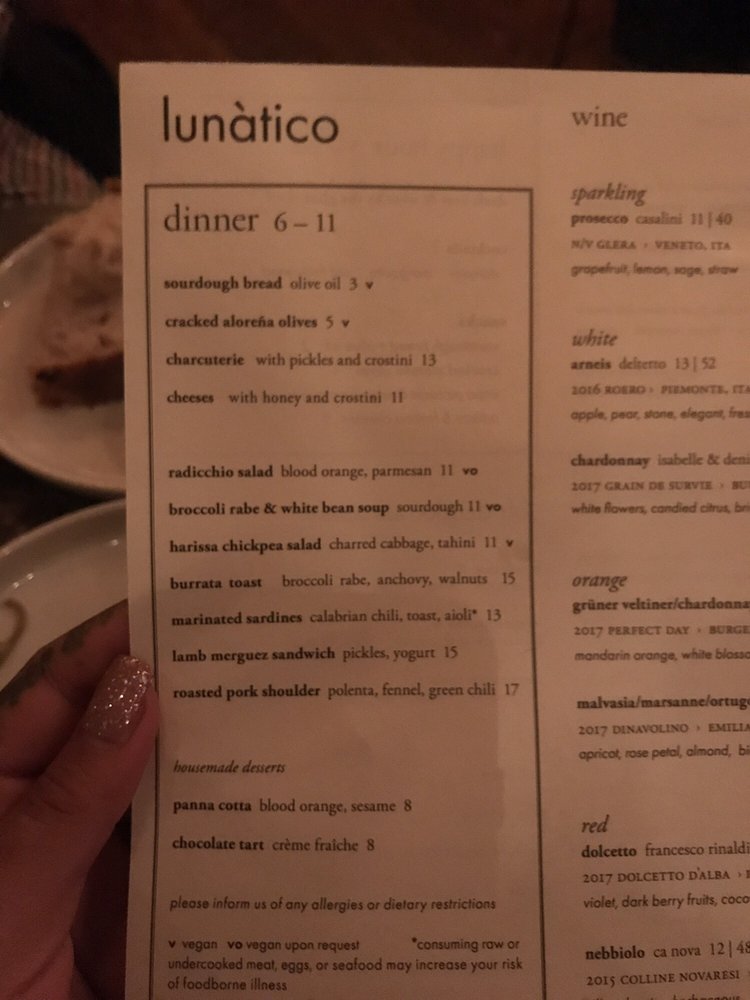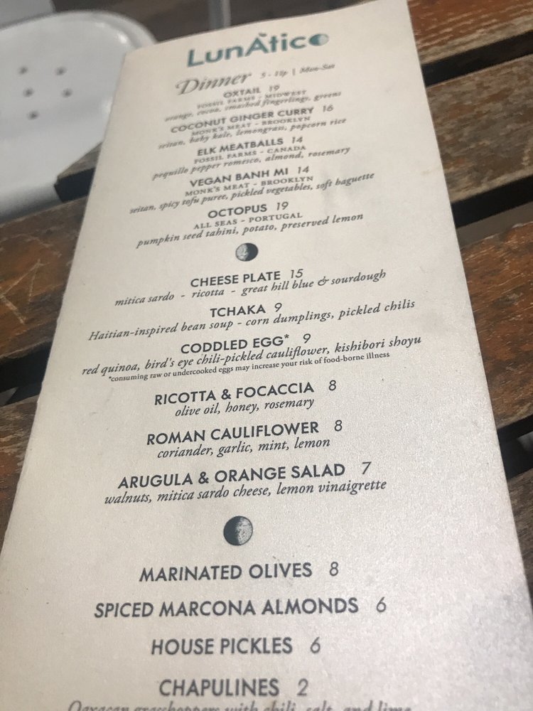 "Introducing the menu at LunÀtico, a tapas/small plates joint in Brooklyn with a music venue and cocktail bar vibe. Known for its intimate and lively atmosphere, LunÀtico offers vegan and vegetarian options, along with a full bar serving TingTing concoctions that customers rave about. The roast chicken and specialty cocktails are must-tries, complemented by a cozy space and friendly staff. Live music sets the tone for a great night out, but be prepared for a bustling crowd and loud environment. With a limited but enticing menu, including squid ink risotto and seared rainbow trout, LunÀtico provides a unique dining experience perfect for date nights or solo outings. Remember to arrive early to secure a table for the show and indulge in the flavorful dishes and craft cocktails that this venue has to offer."